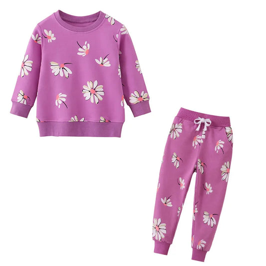 Girls’ Cotton Outfit with Long Sleeve Sweatshirt and Pants with Floral & Animal Prints - Red, Pink, Beige, Purple