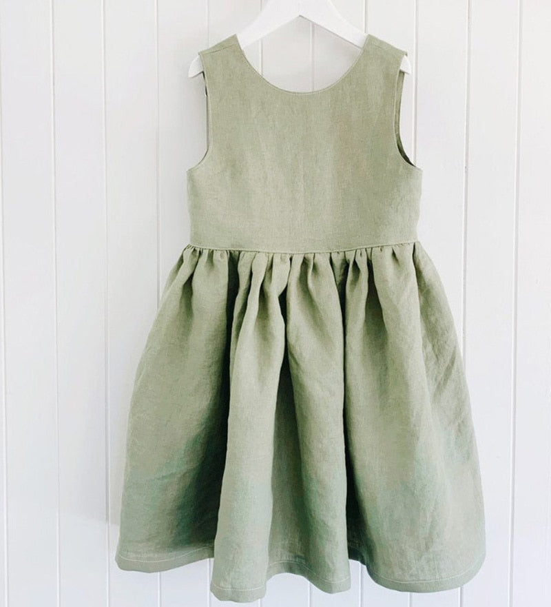 Girls New Back Split Deep V-Neck Sleeveless Cotton And Linen Dress - Green, White