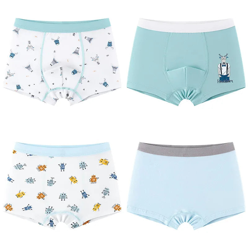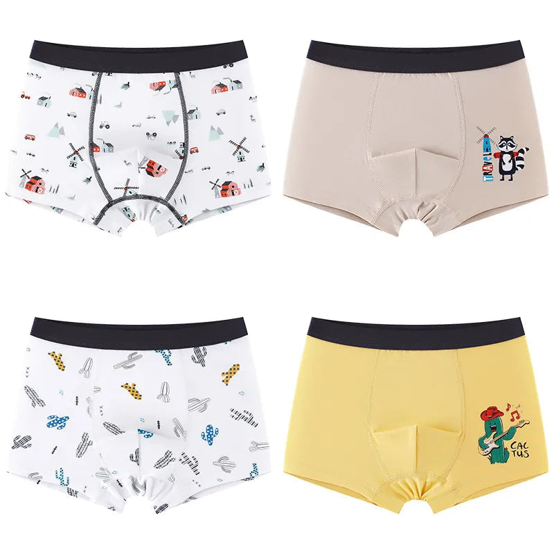 4pcs Soft High Quality Cotton Cartoon Cat Printed Boxer Briefs for Boys 4-12 Years