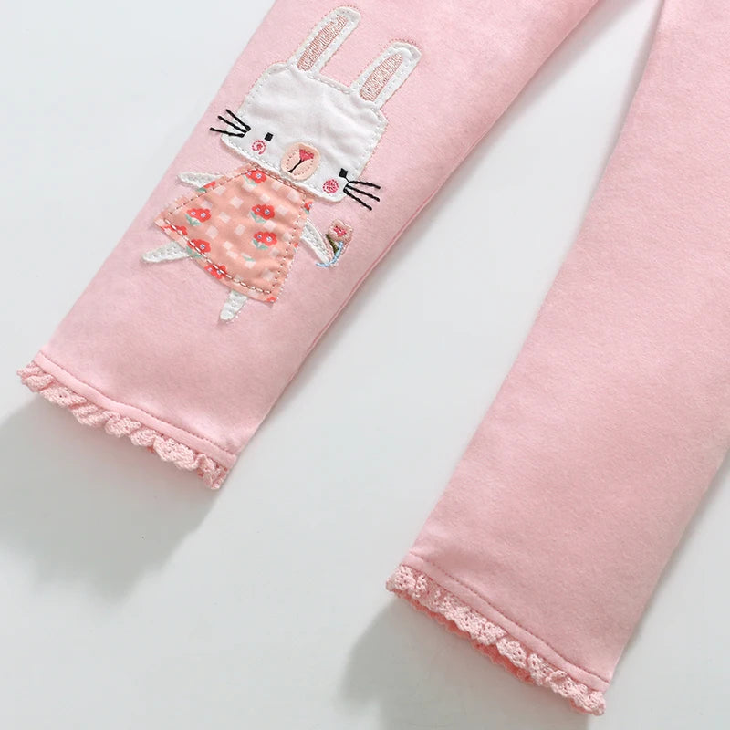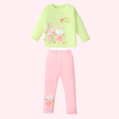 Girls’ Cotton Long Sleeve T-shirt & Leggings with Cute Animal Embroidery - Pink & Light Green