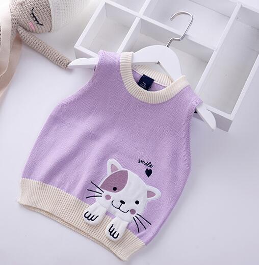 Girls Cartoon Embroidered Cat Knitted Vest - Blue, Green, Lavender